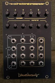 follow the arrows on the cv inputs 1 through 6 to see the direction of crossfade on the center inputs. outputs are in black.