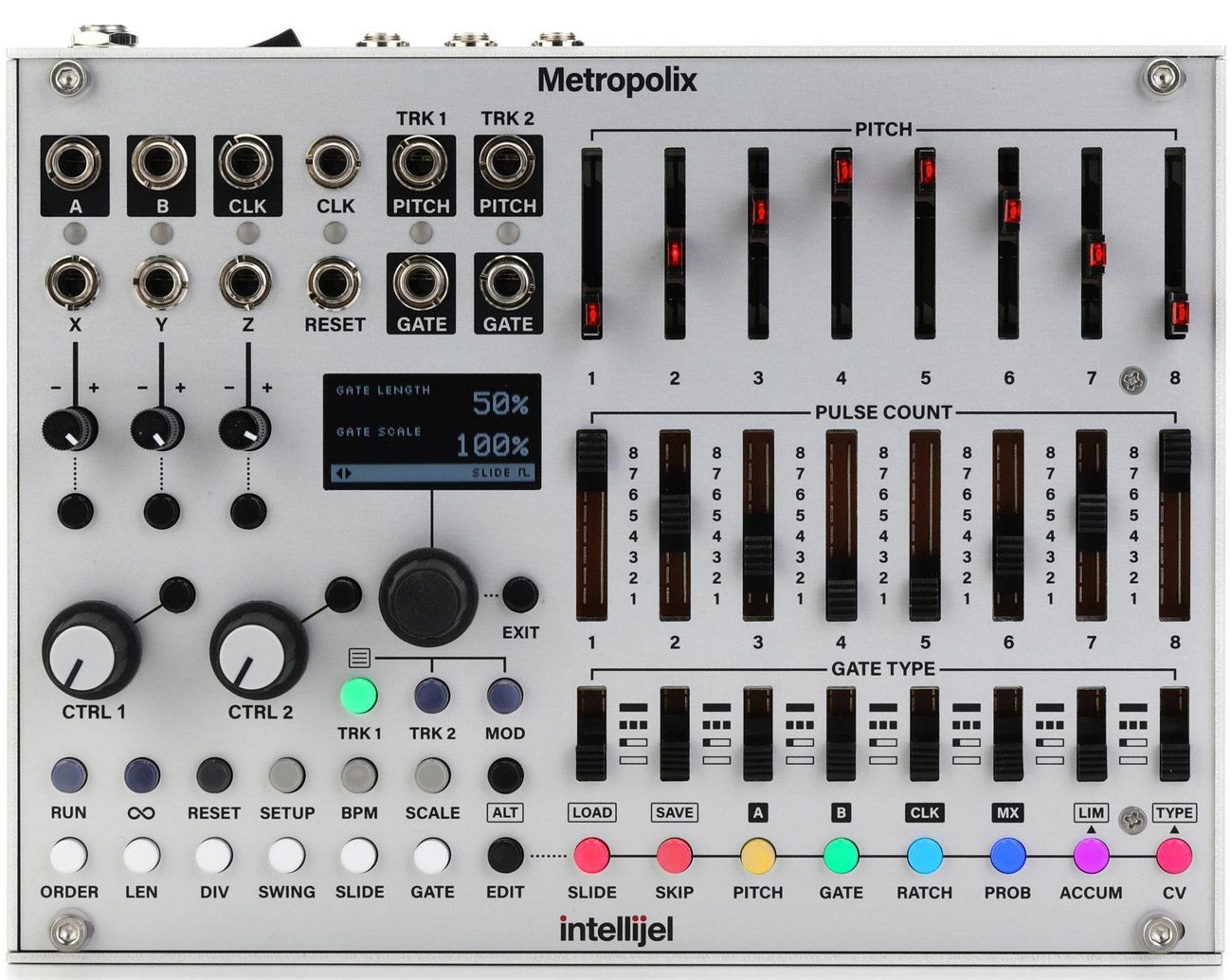two tracks (trk 1 and trk 2) are variants of a main pitch/gate sequencer, which is programmed via the pitch sliders, pulse count and gate type switches. each track interprets the main sequence in a variety of ways - creating complementary variations that enable you to generate counterpoint, polyrhythms, and all manner of sonic
