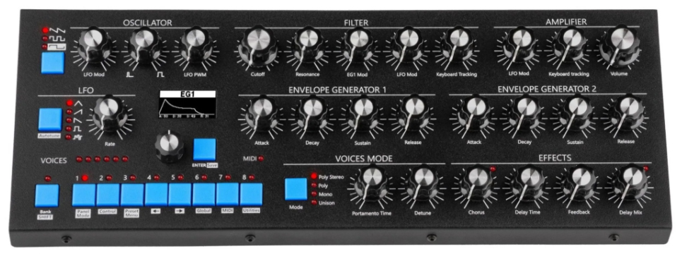the synthesizer offers a stereo ensemble type chorus effect. it simulates a string or vocal ensemble using multiple delay lines modulated by their dedicated lfos. the stereo delay can reach a maximum delay time of up to 1 second.