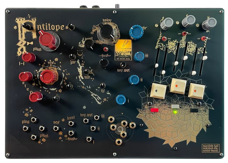 antilope is a pseudo drum and dynamics machine, a dual pingable fully resonant filter, with distortion + multifx feedback path, all controllable through a pattern recorder with 3 cv sources switchable between morphable ad envelopes or stepped voltages.